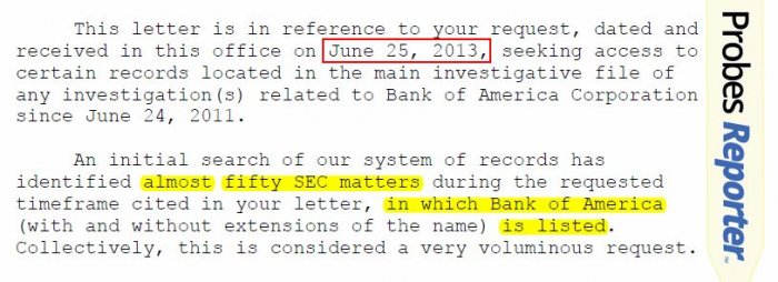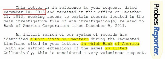 - Bank of America (BAC) We filed FOIA requests on BAC three times since Sep-2012. BAC was listed in almost 50 SEC matters in Jul-2013. That climbed by ten, to almost 60 by year-end, Dec-2013. BAC has made specific reference to SEC investigative activity in its respective filings. See Exhibit A, below.