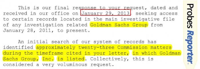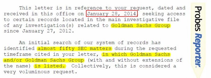 - Goldman Sachs (GS) We filed two FOIA requests on GS since Jan-2013. GS was listed in approximately 23 matters at Feb-2013. This more than doubled over the next year, to almost 50 SEC matters by the end of Jan-2014. Goldman Sachs did not directly disclose the presence of any SEC activity in the latest 10-K filed on 28-Feb-2014. GS made what we call “Generalized disclosures of regulatory activity and/or investigations.” See Exhibit A, below.