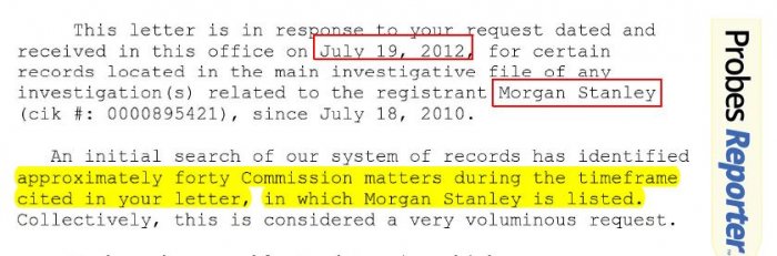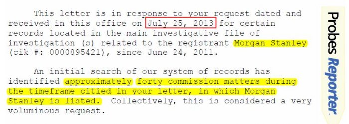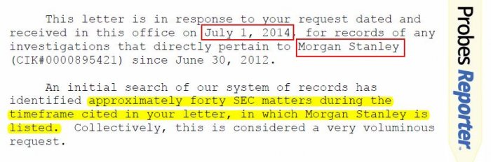 - Morgan Stanley (MS) We’ve researched MS three times since Jul-2012. In each of these three times, the SEC came back and said MS was listed in approximately 40 SEC matters. We were first told that in Sep-2012. The most recent response giving the same data was Jul-2014. MS has made specific reference to SEC investigative activity in its respective filings. See Exhibit A, below.