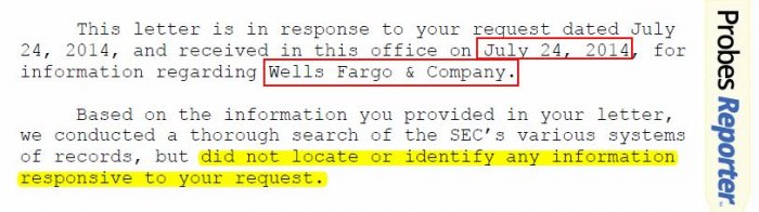 - Wells Fargo (WFC) We found no signs of SEC investigative activity at Wells Fargo in the three FOIA requests we filed since Aug-2012 through our most recent response received Jul-2014.